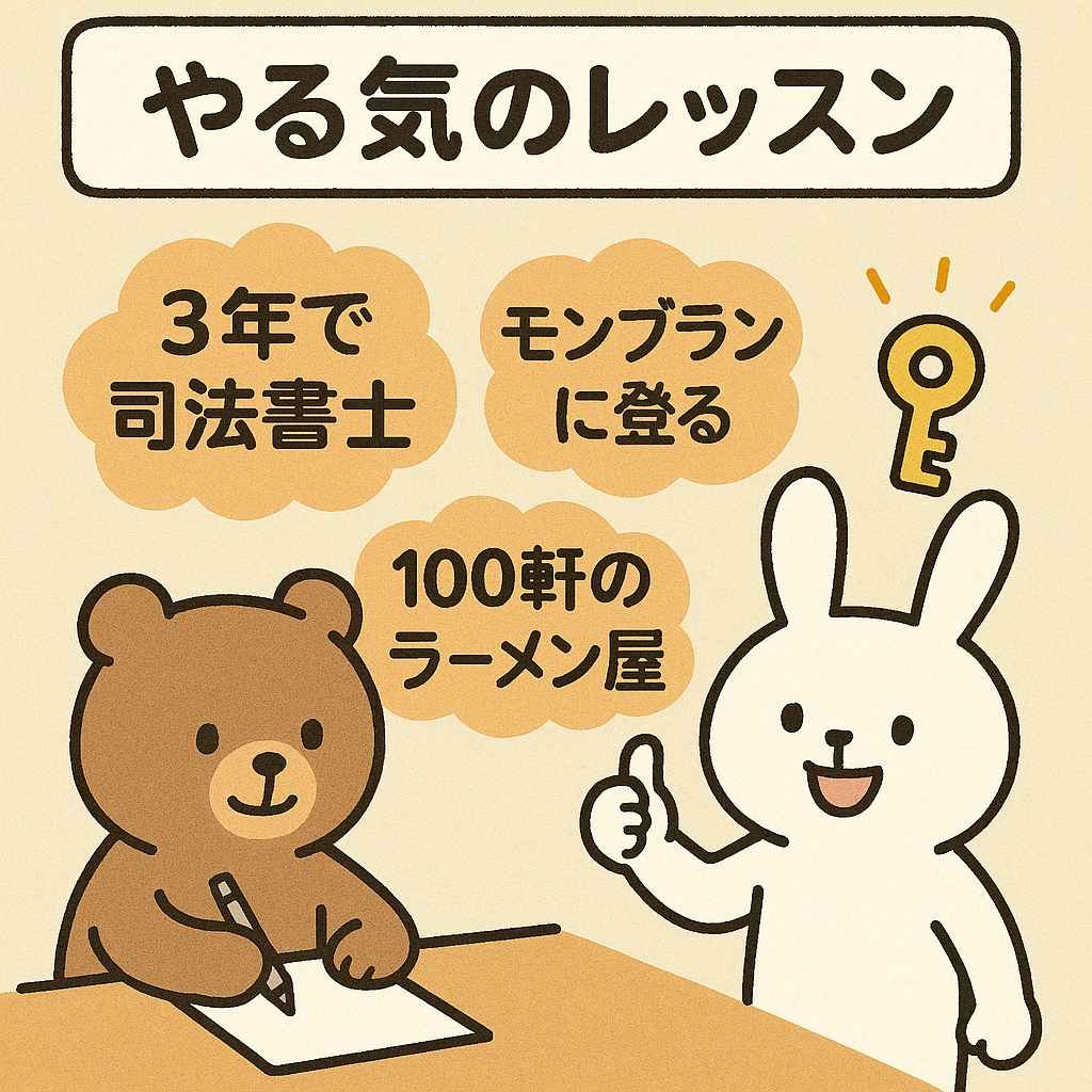 「なにか資格がとりたいなあ」とたまに思うだけでは永遠に資格は取れないでしょう。心に「司法書士」「モンブラン」「ラーメン屋」が刻まれているから継続できるのです。