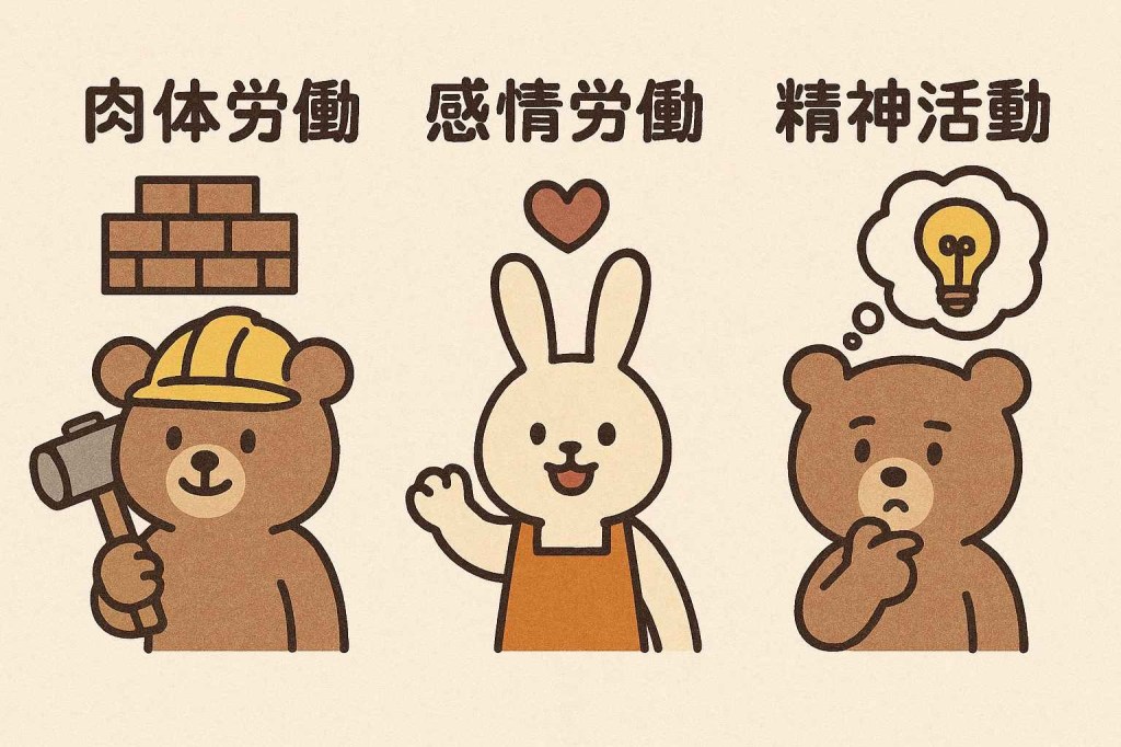 仕事には三つの種類があります。肉体労働と感情労働と精神活動です。この三つはどのような仕事にも存在しますが、仕事の種類によって三つの比率が違ってきます。